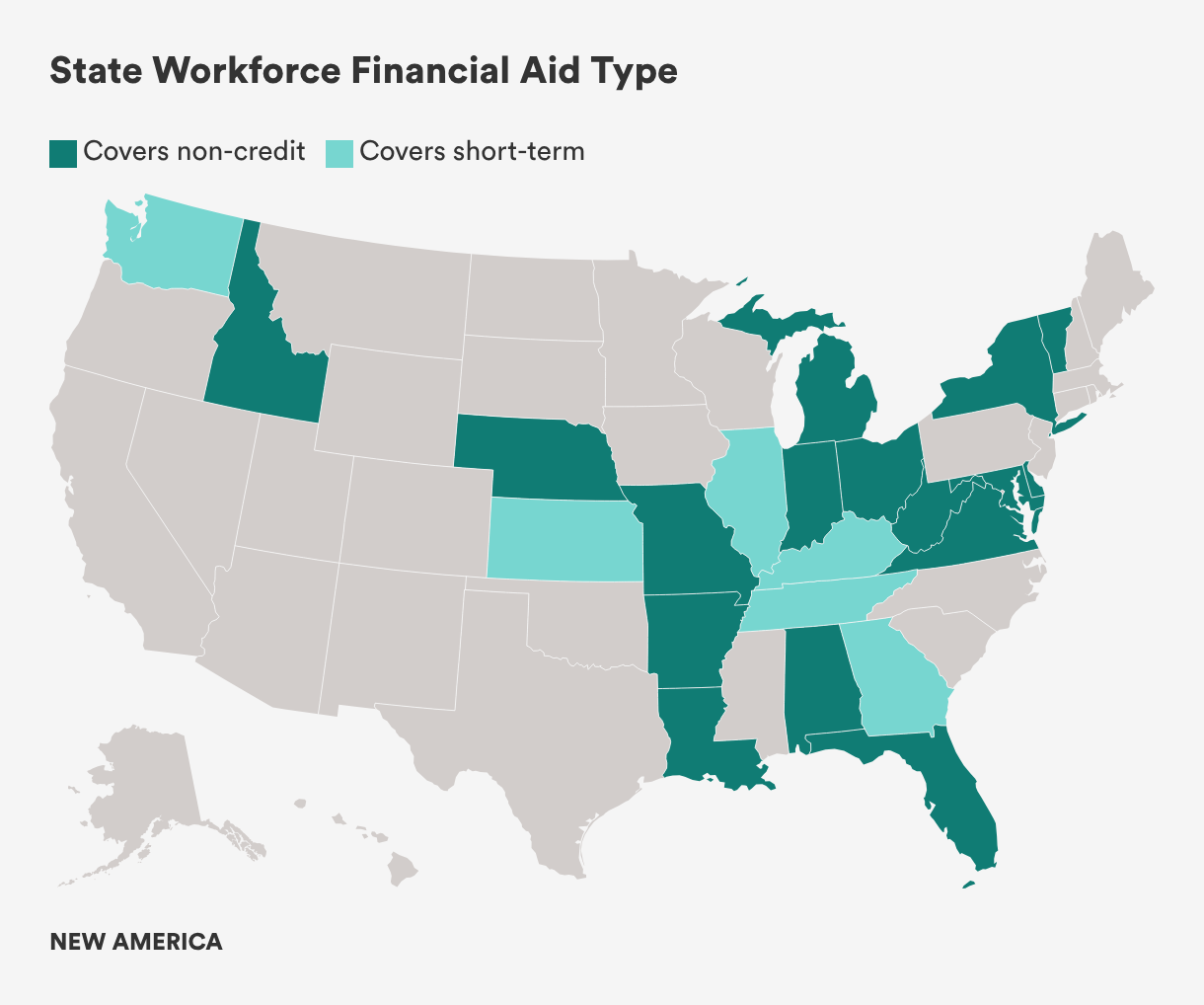 This inventory is an initial scan, not an exhaustive audit. State financial aid programs are often complex and change quickly—eligibility rules, approved program lists, and funding mechanisms vary widely and are sometimes updated annually. I likely missed nuances and may have misclassified some programs; if you see omissions or corrections, please contact me at workforcepell@newamerica.org.