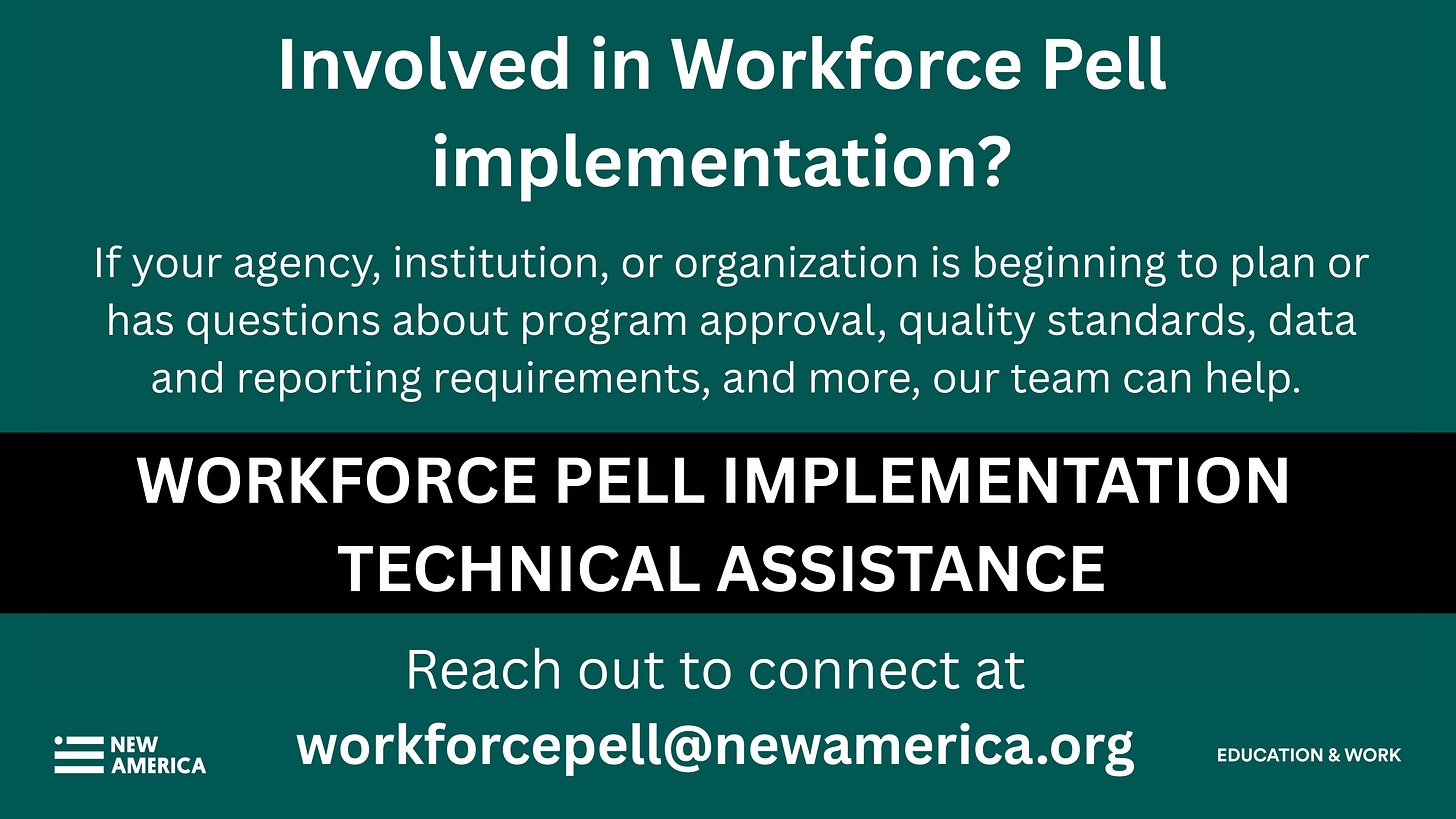 In that spirit, I want to highlight this excellent piece from my colleague Iris Palmer at New America, “Why Workforce Pell Implementation Matters Beyond July 2026.” Iris moves us past the launch date and toward the long implementation horizon that will determine whether Workforce Pell truly drives alignment across education and workforce systems and delivers economic opportunity at scale.